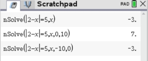 The TI-Nspire CS II non-CAS treats absolute value as a numerical piecewise function (in parts), giving one answer (which is the answer closest to the origin).